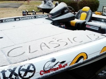 Some of the 53 contestants in the BASS Masters Classic, which begins today, are trying to make themselves believe that this year’s championship in northeastern Oklahoma in February isn’t about the weather. Yeah, right. It isn’t about the 20 degrees weather or the wind chill factor of near ZERO or the snow or the frozen trolling motor props, frozen fingers, boat compartments frozen shut or the…well, you get it. Just one look at the boat at the right . . . Trust me — It is about the weather. I have