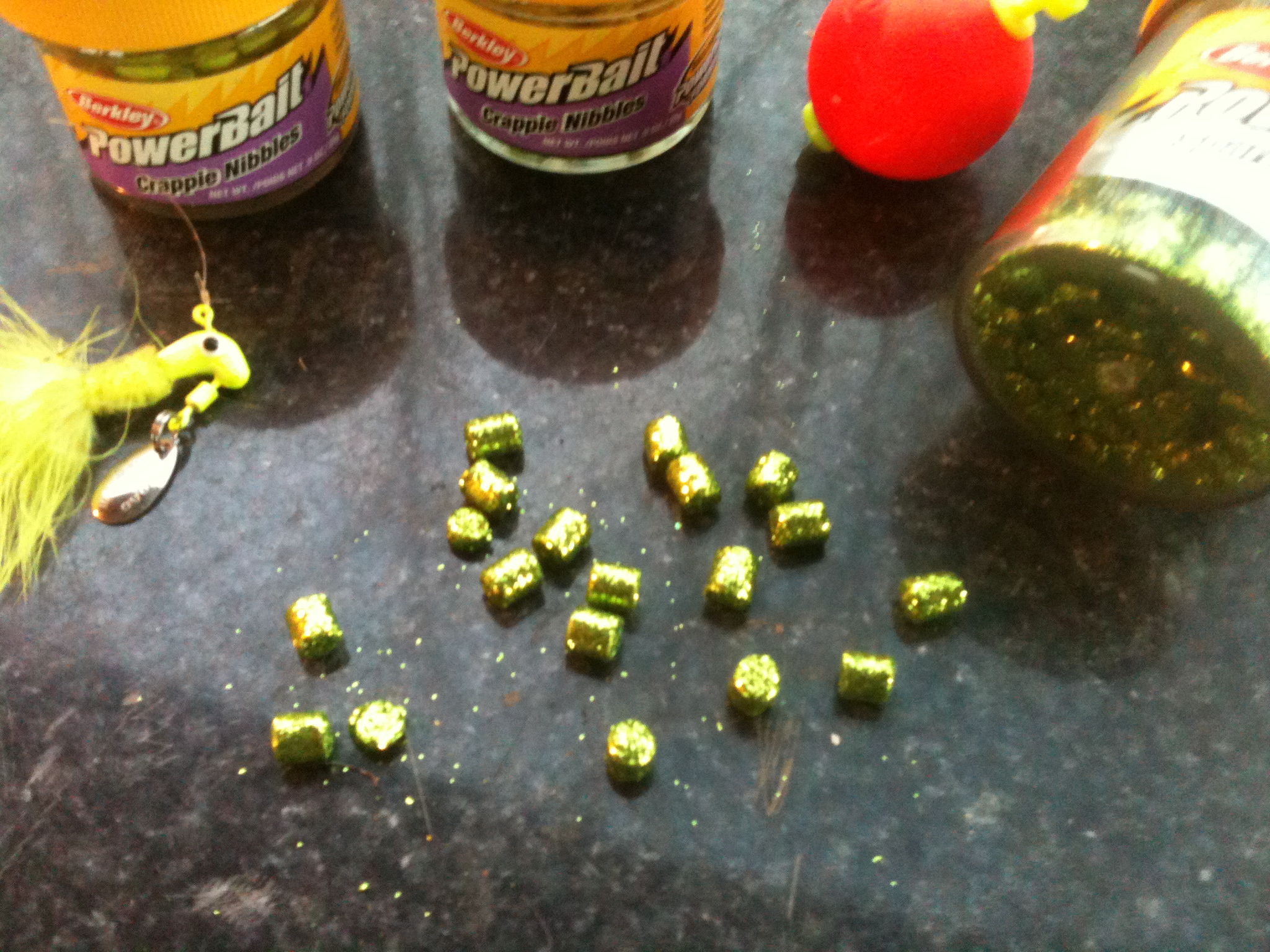 But they are a necessity for catching white perch on a regular basis: Crappie Nibbles. Crappie Bites. Whatever you want to call them. They are little chartreuse, white or yellow little pencil eraser sized bait enhancers. And boy, in the spring, they really attract the white perch. Sometimes I think the fish are hitting them instead of the jig or mini-spinner. Some folks think you have to use a “nibble” before you can get a bite. They may be right. My personal favorite is the chartreuse with gold glitter, but they come in all kinds of colors. It’s hard to fish with these little rascals and keep it a secret. Usually you have little pieces of glitter on everything you touch for about three days after you use them. They fall apart because they are mushy. I heard that you can put them in the microwave for about 20 seconds and when they cool down, they are tougher. But man, can you imagine the smell?
