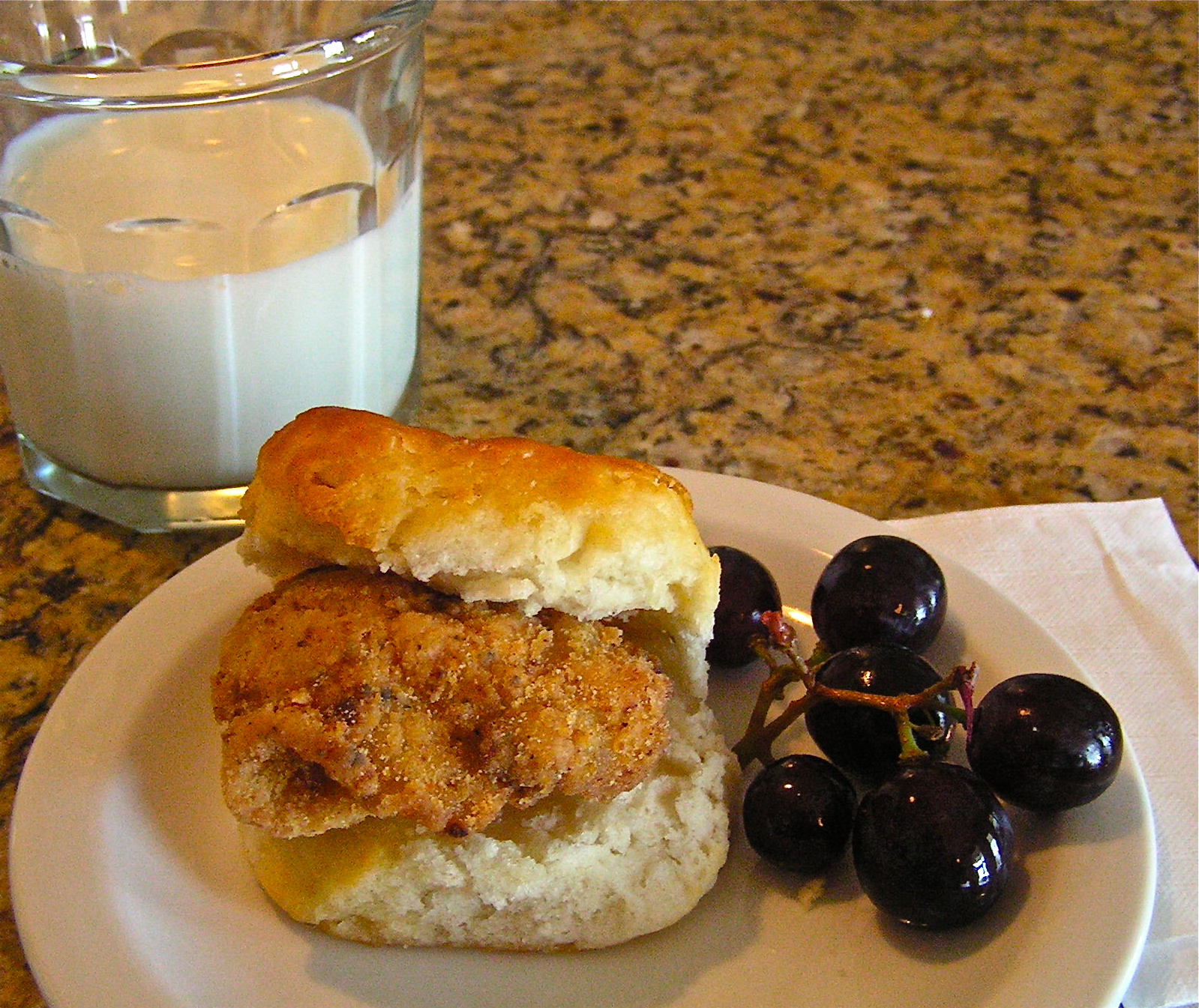 For years, I’ve loved eating a piece of warmed up leftover fried fish on a biscuit with a little piece of cheese and a bit of mustard. Serve it up with a few grapes or strawberries and a glass of milk and shut yo mouth, Paula Deen!
