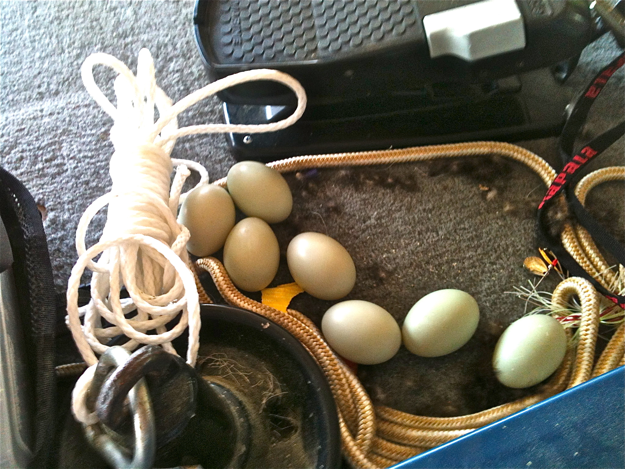 When I went down to get some fishing baits out of the boat Sunday afternoon, I was met face-to-face by a flapping Mallard Hen (I haven’t been that close to a duck since December when my son tried out the Triple Threat Duck Commander call he got for Christmas). This she-duck was taking off from between the trolling motor foot pedal, anchor rope and a tackle box on the boat’s front fishing deck. When my heart started beating again, I noticed she had also left me a gift — 20 or 30 tail feathers and seven fresh duck eggs. Count ’em.