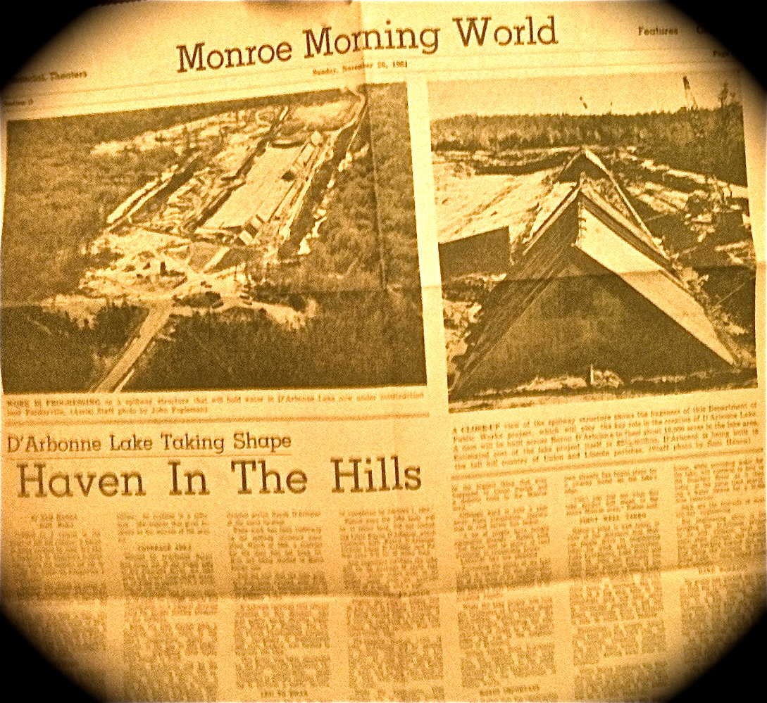 “Cradled in a canyon in the heart of tall hill country, a haven is being created by man. It’s like a flashback to America’s frontier days when the settlers set out the make a better life by conquering a wilderness. Because life should be better in northeast Louisiana when D’Arbonne Bayou Lake is completed at a cost of several million dollars. You say it is only a lake, this D’Arbonne project north of Monroe; but you can’t appreciate it fully until you’ve drive to Farmerville, parked on top of a towering Union Parish hill and visualized a clear blue lake below.