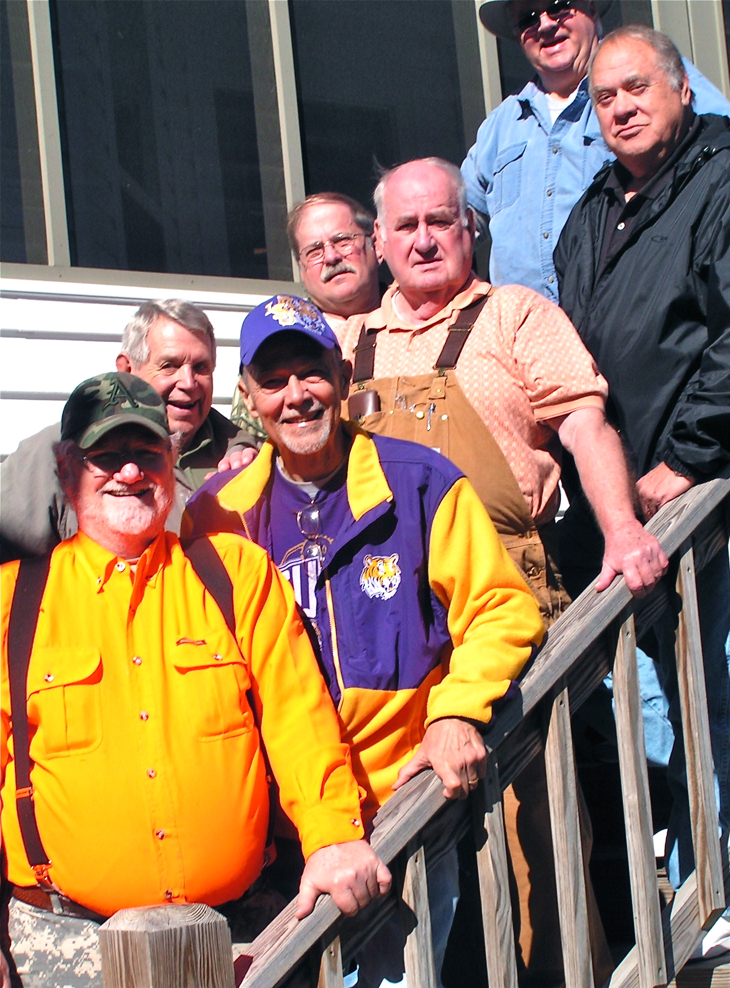 At one time, we were all in one place in our lives, working to make Bastrop a kinder, gentler city and we are all tied to making paper in one way or another. But potholes in the economy put a closed sign on our door and ran us down different roads. For example, Dr. C drove in from his job in Texas to deer hunt near home in Arkansas and found his way down to Louisiana again for the SumoFest. He did wear LSU colors although he’s a red piggie at heart. Maybe he knew something. Dub came from his home in Arkansas, after catching an early plane from some little town in Virginia where he still w… (oops, almost wrote THAT word….) that I don’t even remember the name of. He did bring us a fresh parched bag of Virginia peanuts, though. You get the picture. The rest of us (Big H, little h, KB, TC and p) all live a little bit closer, but we’re scattered. Everybody has a job. Dr. C keeps up with honors and awards. W keeps us safe. KB keeps up with the paperwork. TC grows food for coach Miles. And p keeps us regulated. As I said, h brings the nana puddin’ and the latest news. H just buys the groceries, the fish bait, cooks, cleans up the mess and handles public relations issues the group leaves in its wake. I must admit, TC did offer to help pay for the groceries, but withdrew the offer when he found out I didn’t have change for a quarter. We don’t use real names simply to protect the guilty. There is significance to the casing of letters as well, but I won’t go into that here. You may recognize some of them in the photo, but please don’t tell. The Witness Protection Program is already costing taxpayers enough. Besides, they are not here any more.