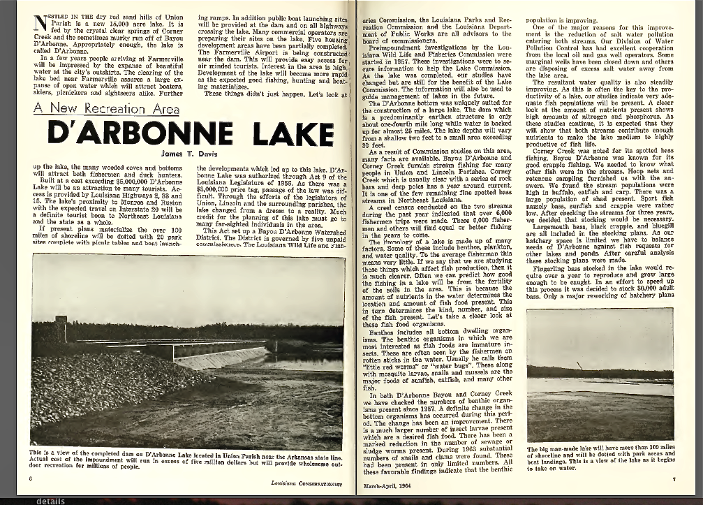 It took me 50 years to learn that. When reading the “Louisiana Conservationist” March/April 1964 issue, I found that out. As part of our ongoing recognition of Lake D’Arbonne’s 50th anniversary this year, we’re sharing some of that article in a two-part series by writer James Davis. The first part was yesterday.
