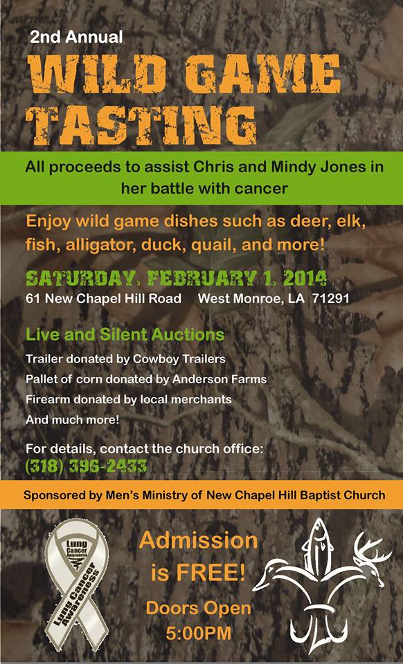 Saturday, Feb. 1, New Chapel Hill Baptist Church will host it’s second annual Wild Game Tasting with benefits to go to assist Chris and Mindy Jones. There will be some awesome auction items, like a trailer, deer food and a firearm and more! Admission is free and doors open at 5 p.m. The church is on 61 New Chapel Hill road in West Monroe.