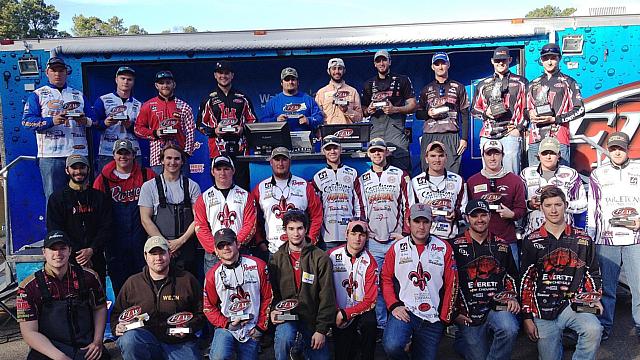 1st: Lamar University – Quinton Evans, Orange, Texas, and Colby Ogden, Kountze, Texas (five bass, 19-6, $2,000); 2nd: Louisiana Tech University – Matthew Loetscher, Many, La., and Caleb Boudreaux, Doyline, La. (five bass, 18-2, $1,000); 3rd: Nicholls State University – Trevor Leblanc and Jess Robertson, both from Houma, La. (five bass, 17-6, $500); 4th: Lamar University – Brandon Simoneaux, Bridge City, Texas, and Josh Bowie, Port Neches, Texas (five bass, 17-3, $500); 5th: Sam Houston State – Robert Laskoskie, Kemah, Texas, and Jared Pruitt, Crowley, Texas (five bass, 15-11, $500); 6th: Texas A&M – Josh Bensema, Willis, Texas, and Vann Millican, College Station, Texas (four bass, 14-11); 7th: University of Louisiana-Lafayette – Joshua Clark, Merryville, La., and Eric Fusilier, Ville Platte, La. (five bass, 14-7); 8th: Tarleton State-Stephenville – Hunter Edwards, Breckenridge, Texas, and Marshall Hughes, Port Neches, Texas (five bass, 14-3).