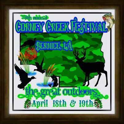 That’s it. The Festival will be held Friday and Saturday, April 18 & 19 in Bernice. You can learn more on the Corney Creek Great Outdoor Festival Facebook page ( https://www.facebook.com/CorneyCreekGreatOutdoorFestival ) or by calling the Bernice Town Hall (318-285-9071).