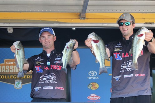 Two teams are tied for third, 1 pound, 10 ounces behind the leaders. Matthew Loetscher and Caleb Boudreaux of Louisiana Tech University and Trent Newman and Jacob Sepeda of Dallas Baptist University each weighed in 9-2. Clayton Godfrey and Garret Lindsey of Stephen F. Austin State University brought in the Day 1 Carhartt Big Bass weighing 5- 1.