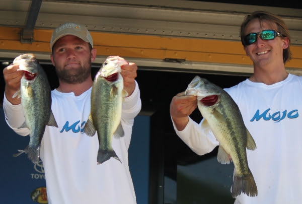 Brett Preuett and Jackson Blackett of the University of Louisiana at Monroe caught 10 pounds, 15 ounces of bass on the Ouachita River to lead on Day 1 of the Carhartt Bassmaster College Series Central Regional. Bassmaster photos