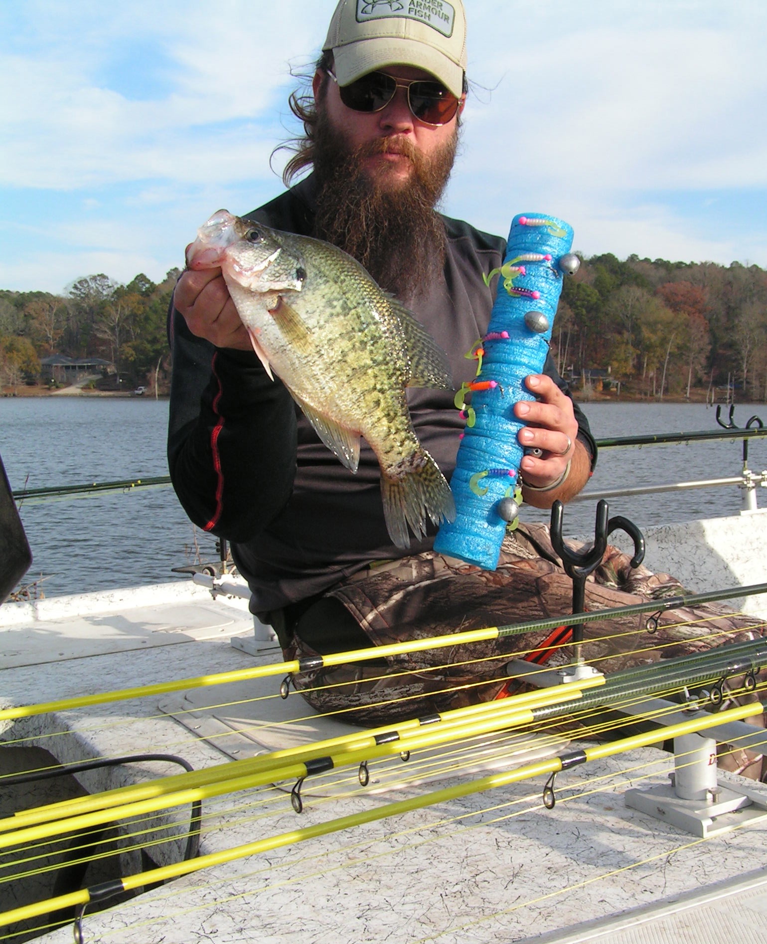 The “kitchen sink” is a Jay creation. He ties a series of four 1/16th ounce lead head jigs with a curly tail plastic jig on each one. He ties three jigs about a foot and a half apart then a two-ounce bell sinker trailed with one more jig on the bottom. It allows him to cover five feet of the water column and when fish are suspended. Trolling speed is important — he suggests between .8 and 1.1 miles per hour because it is at that speed that the curly tails work best. He likes Kalin or Big Bite curly tails. They have good action, the tails spin at a slow speed and they aren’t expensive. Stone ties all that leader on regular clear 10 pound test line and attaches it to the line on his jig poles with a snap swivel. He uses 12 pound hi-vis line on his jigging reels so he can see it better. He uses clear line on the leader where the jigs are because some people think the crappie can see hi vis and although he isn’t sure, he isn’t taking chances. He fishes the rig on a B’n’M Duck Commander crappie trolling rod with B’n’M Pro Staff spinning reel with a 5.1:1 gear ratio.
