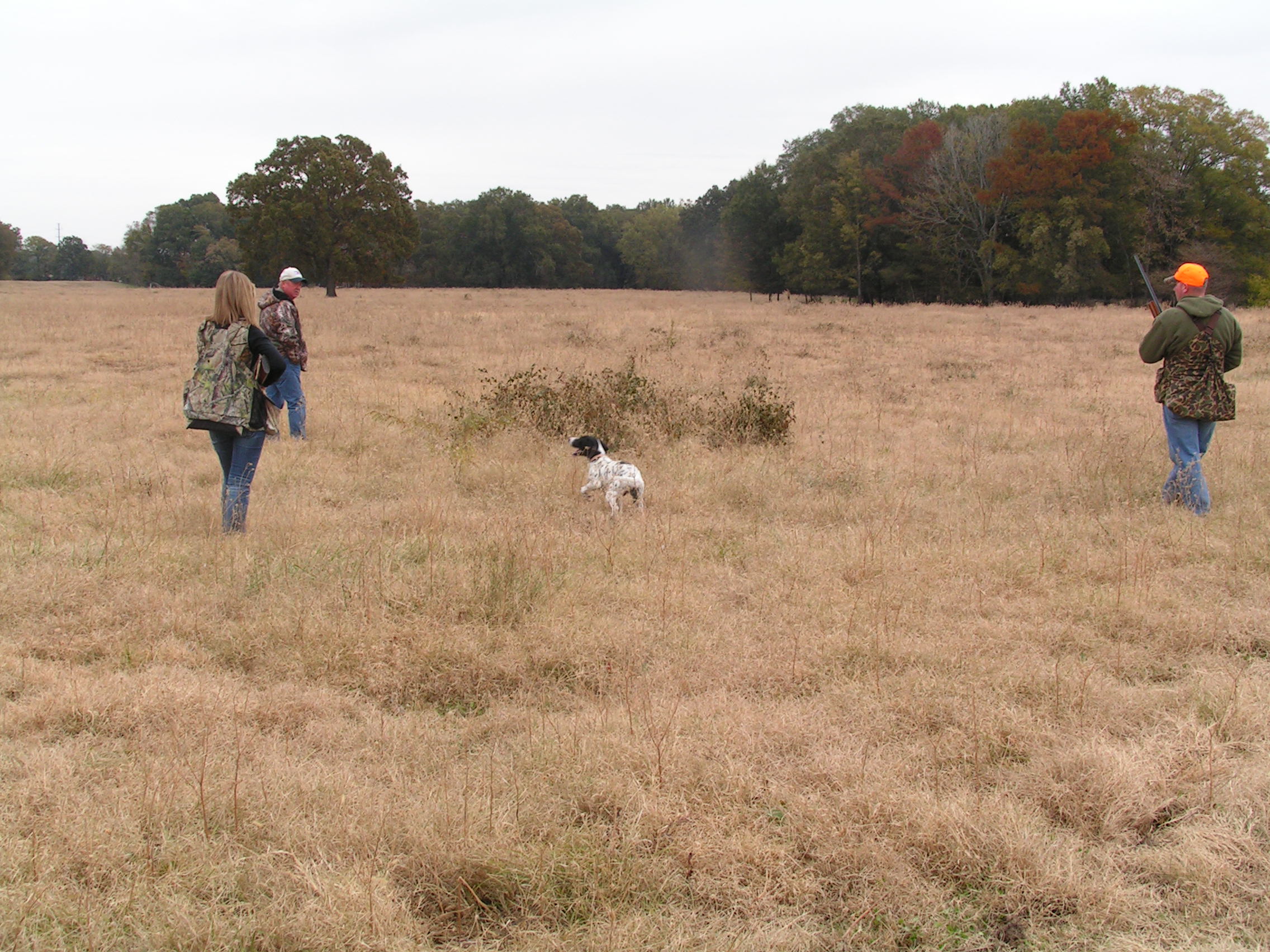 Zeek zigzagged across the field like a kid running to the tree on Christmas morning. Chris and Erin Turner spread out and raised their shotguns to waist level, waiting for Zeek to come to a stop. He did. And he came to point, and a few seconds later two zesty quail zinged up from a patch of high grass. Boom. Boom. The quail returned with a thump to the grass, much to the excitement of Zeek. He bounded to the birds, picked them up and somehwat reluctantly gave them to Rusty Cook.