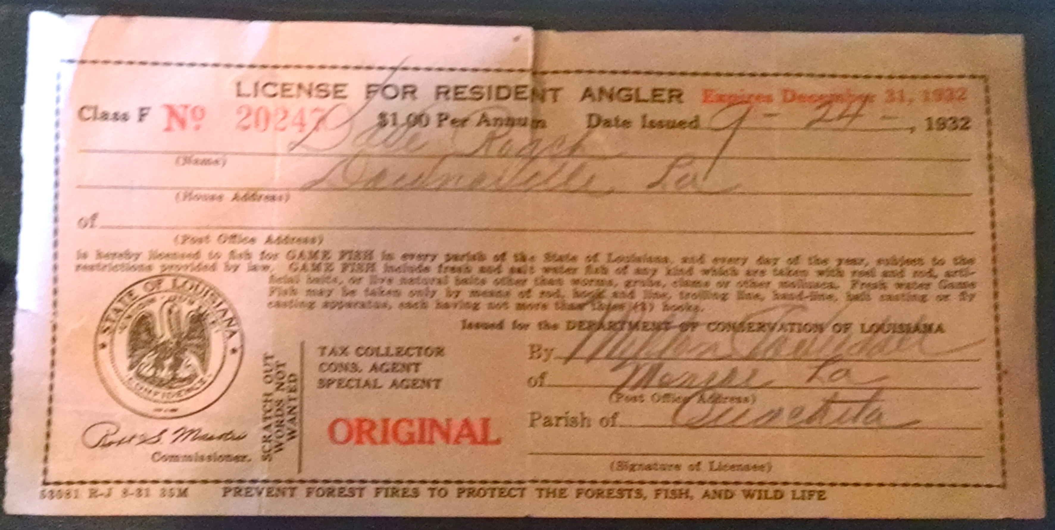 I got the photo above from one of our readers and thought you’d like to see it. It’s from David Roach and it is a photo of a fishing license issued to his grandfather, Dave Roach, back in 1932. Gee, that’s even before my fishing buddy George was born. It’s a Class F license. I assume the “F” is for Fishing! If you read the fine print, it covers pretty much any kind of fishing anywhere in the state. Pretty cool. We tried to find out more about it, and him, but that’s all we’ve got. it’s still pretty interesting! And yes, it was just a dollar!