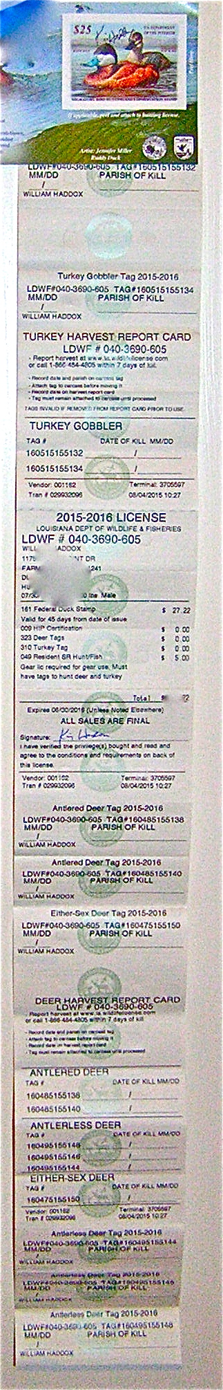 At least I have my two-foot long multi-folding Louisiana State Hunting License for 2015-16. I even got my federal duck stamp, signed it and attached it to the back of my license like Uncle Sam told me to.