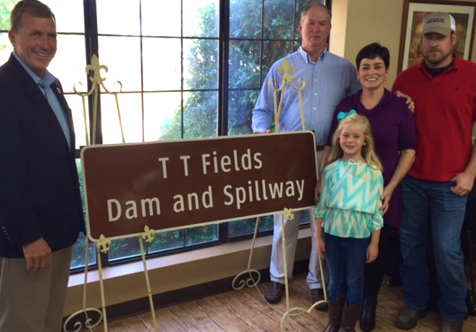 The structure was officially named the T.T. Fields Dam and Spillway with the unveiling of the new sign at the D’Arbonne Country Club. Louisiana Senator Mike Walsworth helped family members Tom “Tuffy” Fields, his wife Bonnie, son Christopher and Tuffy’s granddaughter Ava uncover the new sign to a big round of applause by those in attendance.