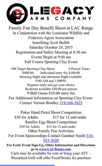 Check out the great event below — a Family Fun Day Benefit Shoot at the Legacy Arms Company Range benefiting Scott Bullitt — Saturday, Oct. 24. Events start at 9 a.m. For more information, contact Gardner Smith at 318-953-3020 or sign up at http://www.LACRange.com