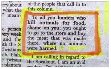 I’m proud to be a hunter. I’m proud to believe in the Bible and thankful for the bounty that God has placed here on this earth for us. Hunting and fishing is part of reaping that bounty. And yes, I pray for the lost, spiritually lost and intellectually lost (see above). I’m proud to say that our hunting club is identified by signs marking its boundaries not only with the club name, but with this Bible verse: Genesis 27:3. . .