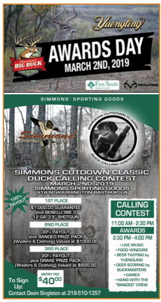 You don’t have to get in the woods to see a bunch of big deer. Just come to the Awards Day for Simmon’s Big Buck Contest Saturday, March 2 in Bastrop. There are more big deer than you can dream of.