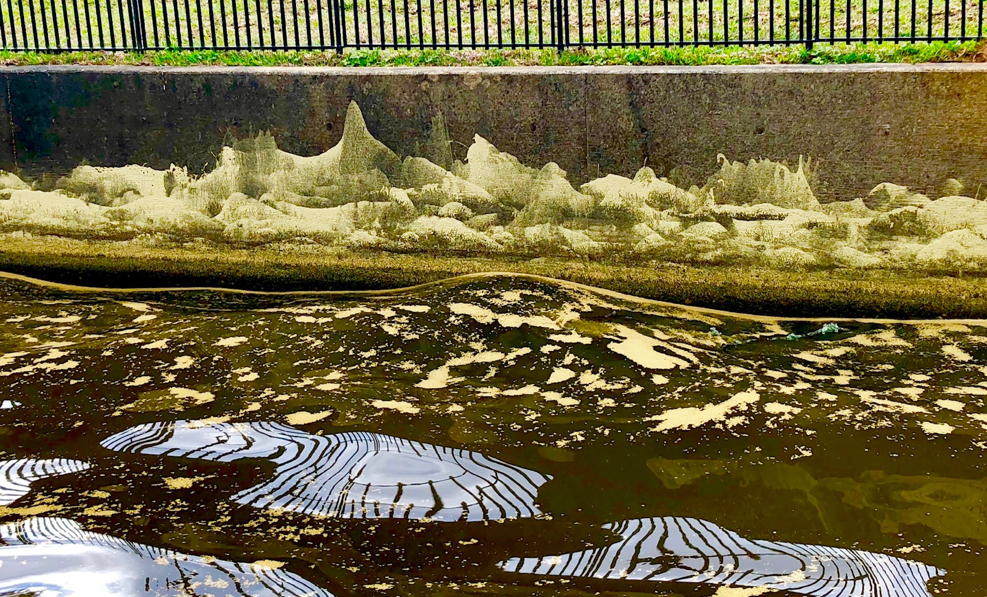 Here’s how I think it happened. Thursday through Sunday the wind kicked up some pretty good waves on Lake D’Arbonne, not to mention waves from about a million boaters out enjoying the good weather and numerous fishing events. The water near the shores is covered in pollen, like the rest of north Louisiana. As the waves splashed pollen up on this concrete seawall at Eagle Point, it dried and started a unique pollen painting. As smaller and smaller waves hit later in the day, it left different levels of distinctive patterns of pollen art on the concrete. The water dropped a few inches over the last two days and left a solid green line as the waters calmed. The green spots on the water and an occasional “clear” spot with reflections from the iron fence added more to it. Amazing!