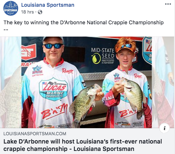 The actual tournament begins Thursday where all the teams will compete. Come Friday, only the top 50 teams from Day One make the cut, finishing up Saturday’s final round with the top 25 teams casting for the crown. Weighin the first two days will be at D’Arbonne Pointe with the final weigin at Railroad Park in Ruston, each beginning at 3 p.m. It’s a first-of-it’s kind three day event for crappie fishing. And I’m very proud that it’s being held on Lake D’Arbonne. These folks could fish — and take their huge economic impact — anywhere in the country. Let’s keep working hard to keep them here!