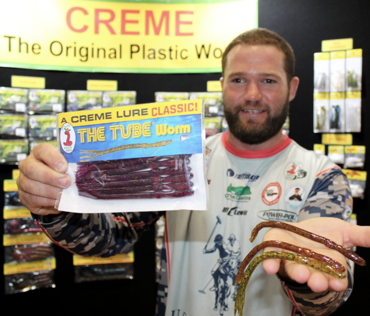 There was me (the old) standing there at the Creme Worm booth with Monroe BASS pro Brett Preuett (the new) and what should we have in front of us? The Creme Worm’s Tube worm, the new version of it’s old Tube worm. It’s been off the market for a while, but brought back by popular demand in new colors. Preuett was talking about all the virtues of the new lure and it’s ability to be fished in numerous presentations, from Texas rigged to floater. Creme has been making worms for 70 years and this year brought back an old favorite in new colors. The head is solid, but the core is hollow, allowing the worm to float from an inch off the bottom all the way to the surface, depending on how you rig it.
