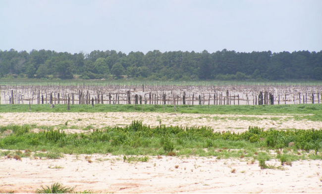 A fishing pier. A pump. A big pile of dirt and rock. And some water. Lots of water.