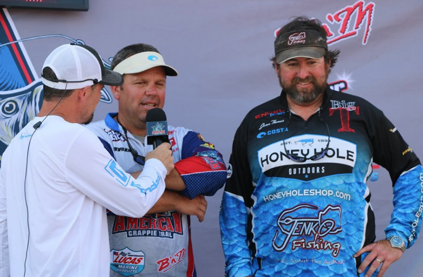 Two other tournament boats came into the small river lake we were fishing. I was stirred up because our fish had come in a small fifty yards stretch. Thankfully they respected our position on the leaderboard and gave us our space. Official start time was 6:30 and eight minutes later, my second Jenko 16’ Slab City Pole was buried in the murky waters and out comes a 1.76 crappie. I thanked the lord and told Scotty and Josh (our spotter) “today is the day”. We say a prayer every morning asking for protection over us and fellow anglers and there was a feeling of confidence in our plan and we were executing just like we scripted. The big fish were here we just had to make them bite. As the morning progressed we got some pressure from a local angler that had to get in on our action. It made us uneasy because the fish had shut off after mid morning. We didn’t have long and we were looming around 11 pounds, needing a couple more good fish. I kept telling Scotty to stick to the plan and grind out our area. The bite stopped at 11 a.m. We still had not culled our two smallest fish. We had two of our cull tags break and one fish that was a cull lost its tag. We needed at least one more solid fish to really contend. Friday we had to go to weigh in early due to struggling fish and we planned to do the same Saturday. Just as we started picking up to leave, my outside pole buried into water and I nailed a 1.68 crappie. We hollered and high fived thinking we just may contend for the title.