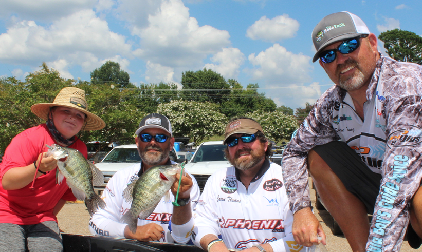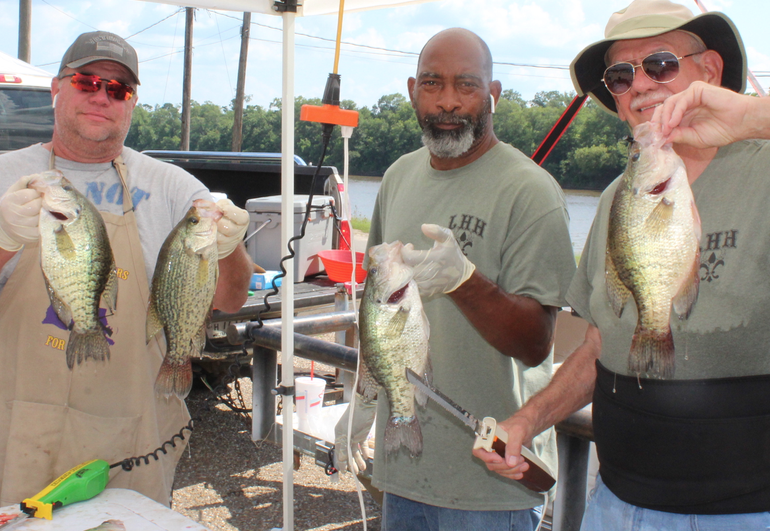 One team that did that was Dan and Sue Dannenmueller of Alabama. They caught fish pulling crank baits with planer boards out in deeper water. They had one bait the fish couldn’t stay off of, but a big catfish ate it early in the second day of competition… Most of the anglers did fish some sort of jig head, many using bladed jigs, but almost everyone had a shiner by itself or as a bait tipper… People had a blast catching fish on the river. Most of the teams that found fish reported catching 20-40 fish a day… Crappie Masters requires anglers to weigh in their fish alive, but in this heat, it’s hard to keep them in good enough shape to turn back. Many of the fish were returned to the river, but those that wouldn’t make it were donated to Louisiana Hunters for Heroes to feed their guests on upcoming special outdoor trips honoring their service.