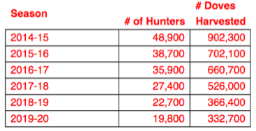 In the 2014-15 season, LDWF estimated that 48,900 hunters targeted doves with harvest numbers around 902,300. By last season, those numbers had dwindled by more than 50% to 19,800 hunters with a harvest of 332,700. Some of that could be due to lack of proper reporting, but it is hard to tell.