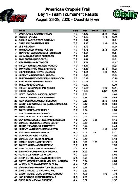 No, I’m not Joshin’ — but the Day One leaders were. Renowned Oklahoma crappie guide Josh Jones and his Oklahoma partner Josh Reynolds caught a seven fish limit weighing 14.02 pounds, a two-pound average. Heck that is good in the spring during the spawn. But in the middle of summer and the day after the worst hurricane ever in north Louisiana? Their big one was a 2.31 pounder! That wasn’t even big fish. Scott Black’s 2.54 claimed big fish honors for the day. Can you say slab city?