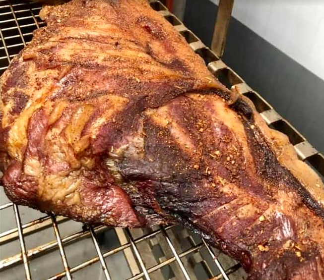 “We do a pretty good number of half hogs or deer and hog hams. We do deer backstrap, too. That’s one of our most popular items,” he said. “We inject the meat, add our special seasoning and smoke it. A half a hog like that one in the photo takes about 14 hours and we’ve learned how to smoke them from some of the best to get the best results.”