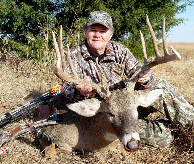My son, Ilar Paul, and I decided to get Thanksgiving behind us and go right after the Kansas gun season. We headed to Kansas on December 13. The weather was always rougher in December and sure enough we hit snow in southern Oklahoma—knowing it was going to be worse in Kansas. We made our first hunt the morning of December 14. Had a good hunt despite the cold. We were hunting from commercially made elevated box blinds which helped cut the cold and wind. The next day we decided to make it an all-day sit. Saw several good bucks but none we wanted to shoot. That afternoon the sun came out and the snow melted a little creating some icy footing.