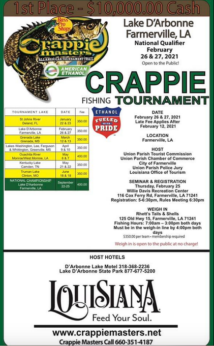 As a bonus for our readers, we’ll have some pre-tournament crappie fishing reports from Kenny Kavanaugh, who not only lives on the shores of the lake but also inside K&M Coffee, Corks and Camo in Farmerville.