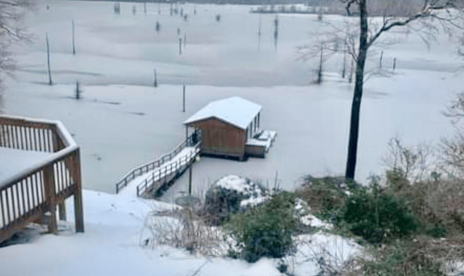 K&M Coffee, Corks and Camo’s Kenny Kavanaugh has seen something he never even dream would happen. He stood on the back porch of his house, looked down at his boat dock and watched Lake D’Arbonne freeze over, especially on the north end where he lives. Then, the roads got so bad they had to close the store for most of the week. They finally got back out Sunday afternoon, but they had to get four-wheel drive vehicles to go get employees to run the store. The lake has thawed, but there is still ice everywhere on the backroads and in the woods. That will change in the next few days.