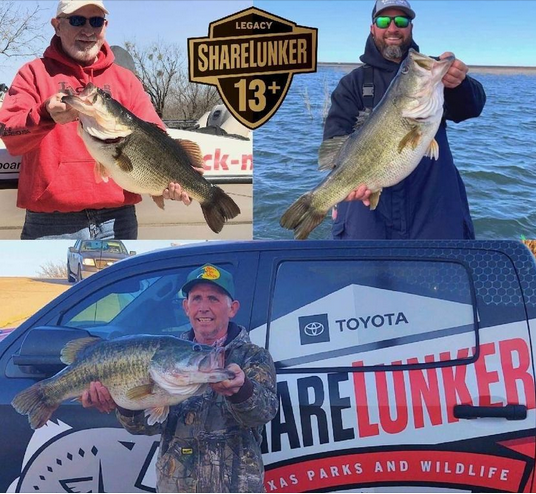 This past weekend was a historic day in that program as well. It was a Triple Crown of monsters as numbers 600, 601, and 602 were caught and submitted. The milestone 600th ShareLunker was landed at O.H.Ivie Lake by Jason Gaston (top right in photo) of San Angelo and weighed in at 13.76lbs.