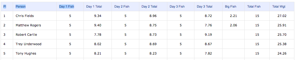 “It was tough out there during the tournament,” Fields told the crowd at Saturday’s weigh-in. “When I finally figured out where they were, it got a little bit easier. Pre-fishing was tough. I didn’t think anybody would catch over 21 pounds, but there were better fish caught than I thought there would be.”