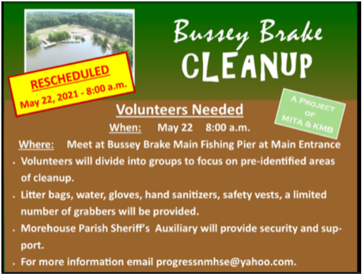 But this Saturday, May 22, at 8 a.m., a group of volunteers will meet at the main entrance of Bussey Brake Reservoir in Bastrop and do a little sprucing up and cleaning up of this fantastic outdoor resource in Morehouse Parish.