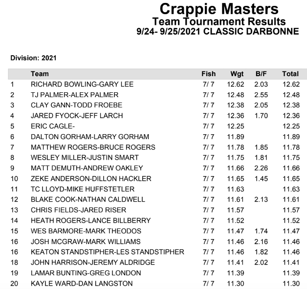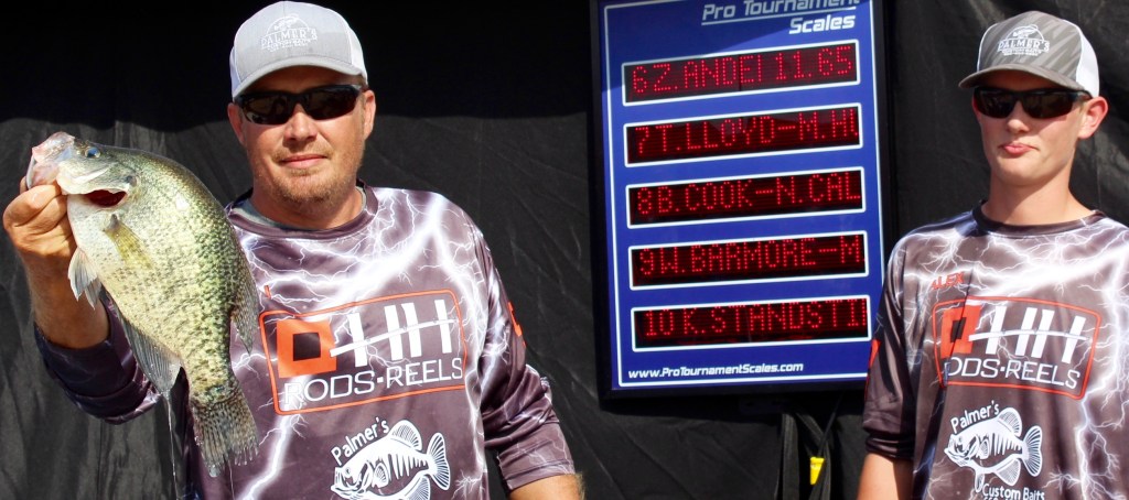 TJ and Alex Palmer, also from Missouri, landed the biggest crappie of the day Friday and came in second not far behind the leaders. The Palmers had seven fish weighing 12.48 and the biggest was a 2.55 pounder, a huge slab for this time of year.