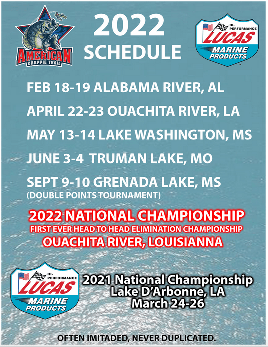“The number one crappie trail in the country is back for 2022 with some exciting changes. New 7 days off limits and a end of the season double points tournament! ONLY 64 TEAMS will qualify for the first ever head to head elimination National Championship! Stay tuned for some exciting information on the highest payouts, the number one crappie show on TV and the most prestigious and transparent trail in the country. Special thanks to Crappie USA for working with us on setting our schedule together for the fisherman and for the industry.More information to follow. Thank you so much to every fan, fisherman, our incredible sponsors and inspiring crappie fisherman who follows and competes on our trail. Here’s to a killer 2022!!!”