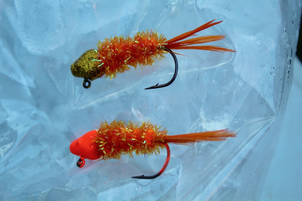 Wesley “Big Sasquatch” Miller’s hand-tied versions of a pumpkin spice jig with a gold and orange head.