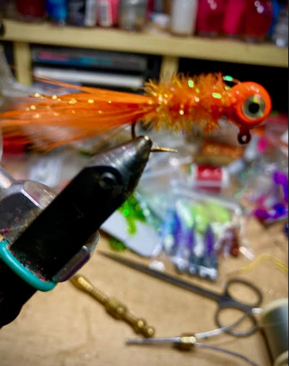 Watt went with four color schemes, one mainly orange and brown, one gold body and orange tail, one orange body with a brown stripe and orange and black tail and one copper and tan with an orange tail. As with all his jigs, he added a single gold or silver foil trailer.