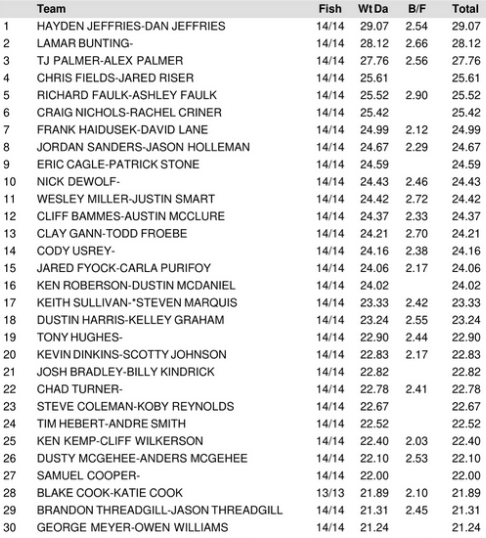 Of the 118 teams ended, only 30 managed to catch a seven fish limit for two days weighing in for a 1.5 pound average or better. The average two-day weight per team was 13.99 pounds, just about a one-pound average. Many said they saw some bigger fish, but couldn’t get them to bite.