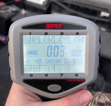 Bailey and Rogers didn’t do too badly, either. Their seven biggest of the afternoon weighed 16.66 pounds and included 3.04, 2.68 and 2.49 pounders. Their scales’ readout is shown below.