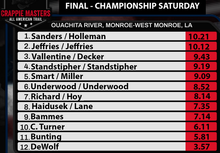 They bested the 28-team field to win $10,000. The Mississippi team of Hayden and Dan Jeffries were second. Other teams besides the top ten were eliminated before Saturday’s final round. On the final day, every team’s weight went back to zero for a best-of-seven-fish battle.