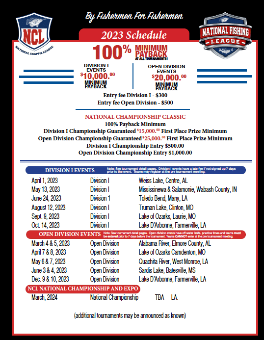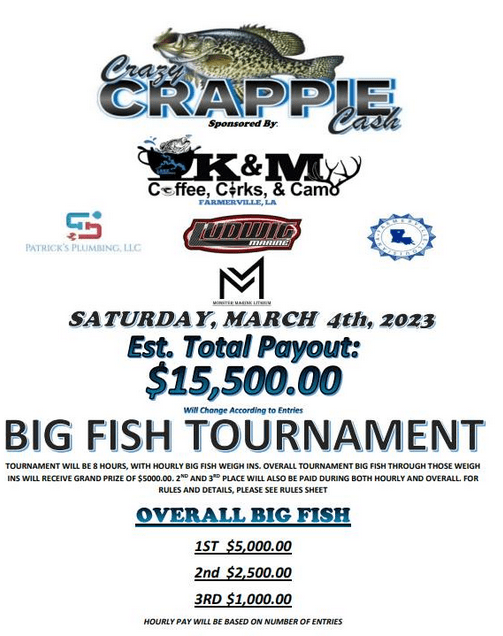 There is also a new pro crappie league, the National Fishing League, that is just being formed and it has tournaments scheduled in the area as well. They are set for the Ouachita River May 6-7 and D’Arbonne Oct. 14 and Dec. 9-10. We will share more information on those as it becomes available.