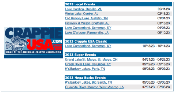 And if the big pro events aren’t your cup of tea, there will be more. Keep you eyes out for details on local tournaments like the Shriner’s Crappie Tournament (May 6) and Crazy Crappie Cash (March 4) event, plus more.