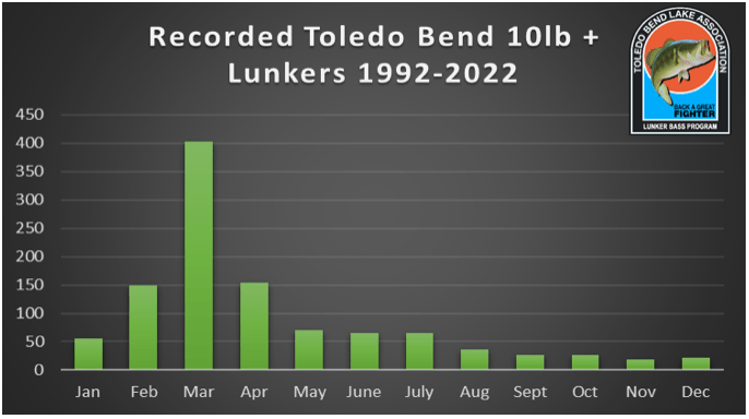 The best is yet to come, if history from recent years continues. If you want to know the best time to catch lunker bass over ten pounds, it’s pretty obvious from looking at this chart from the Toledo Bend Lunker Program.