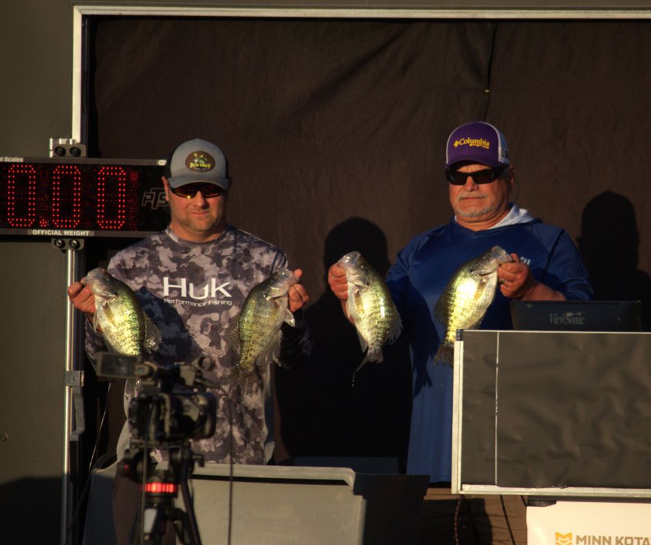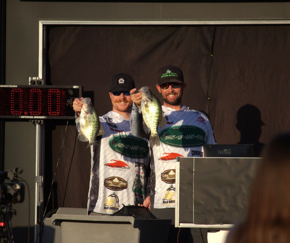 Day 1 saw Eldorado, Arkansas residents RJ Hargett and his son Zack take an early lead when they weighed in 5 fish with a total weight of 11.12 lbs. and a big fish that went 2.53. “We found our fish suspended 8-10’ down in 25’ of water. We had our weight by 11AM and left them for the next day. We bounced around the lake looking for secondary spots for the next day if we needed them,” said RJ.